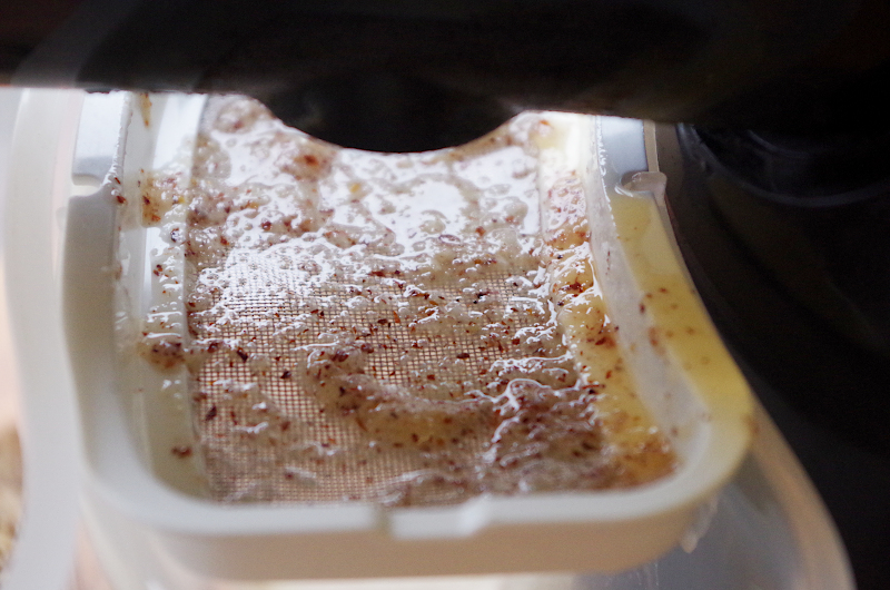 Высыпала в чашу, накрыла крышкой, нажала на старт. Маслопресс довольно оперативно превратил дробленые орехи в масло и почти обезжиренный жмых, масло из фундука и абрикосовой косточки прям лилось струйкой!