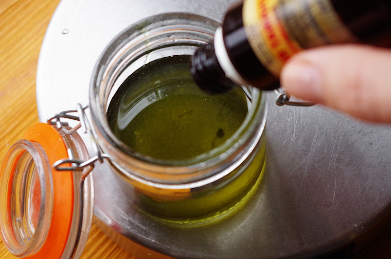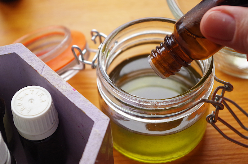 Добавила эфирные масла около 10-15 капель. Если вы не пробовали делать масляную смесь с эфирными маслами для кожи раньше, начните с 5-10 капель, ориентируйтесь на свои предпочтения и ощущения, это полностью субъективный продукт. Эфиры могут быть любыми, но не наугад: или то, что вам нравится, или то, что вы выбрали, исходя из свойств масел, или….лаванда и чайное дерево))) Беспроигрышная комбинация))