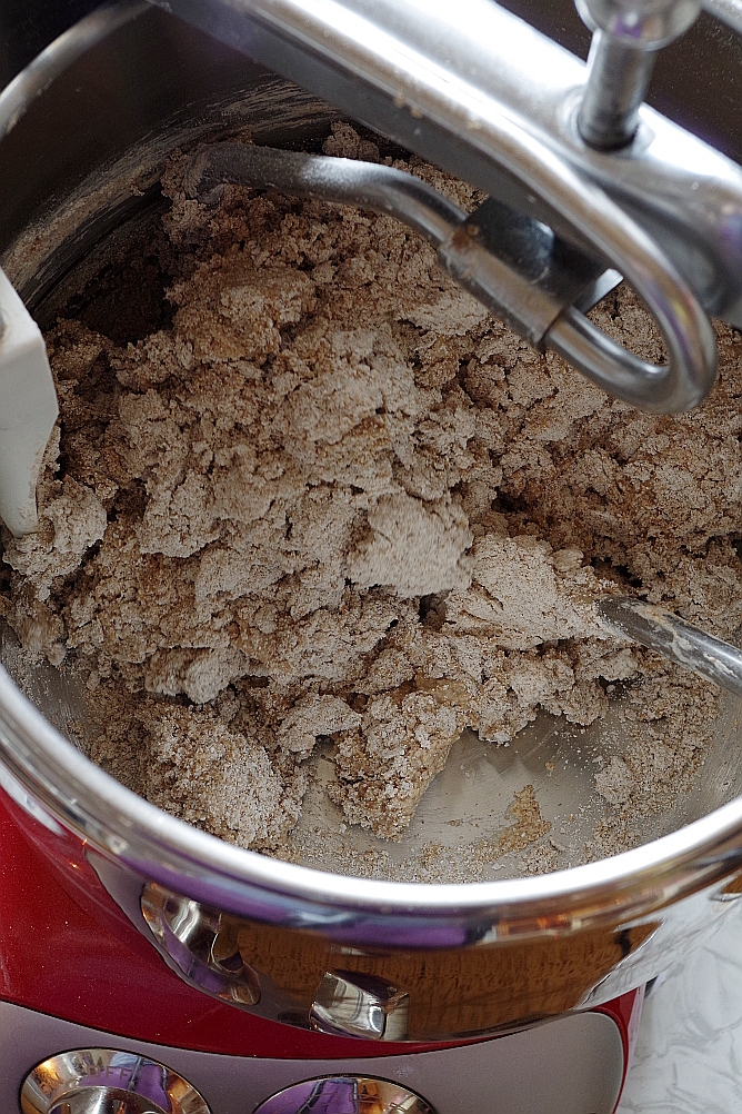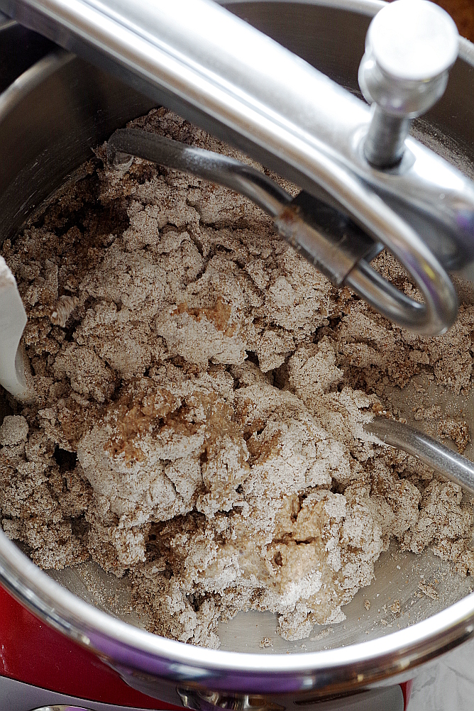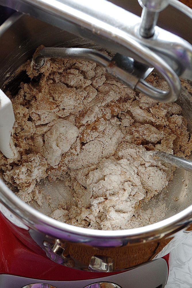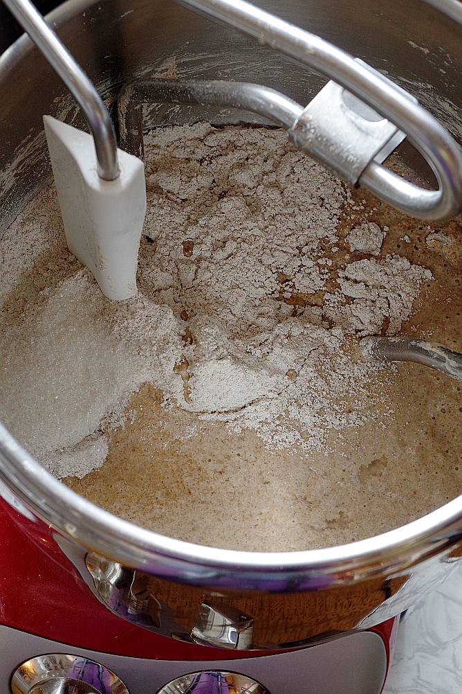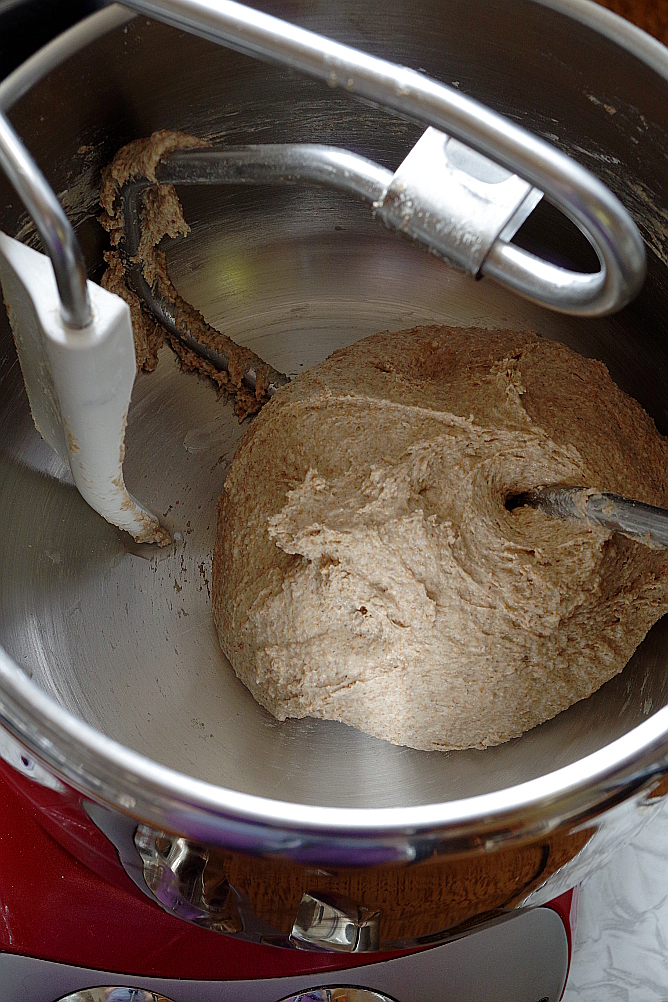 Джеффри Хамельман пишет, что тесто с содержанием ржаной муки от 50 до 70% принято вымешивать 2-3 минуты на 1 или второй скорости. За это время тесто должно стать гладким и все-таки должны быть видны признаки развития клейковины, ведь пшеничной муки в нем немало. Давая свои рекомендации, Хамельман говорит прежде всего о спиральных миксерах и тестомесах, у меня же другой тип тестомесильной машины — с вращающейся чашей, поэтому я решила проверить опытным путем, как быстро мой Ankarsrum Original замесит пшенично-ржаное тесто.