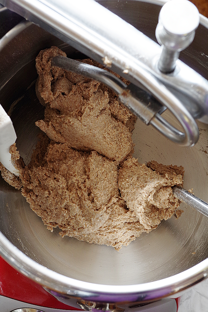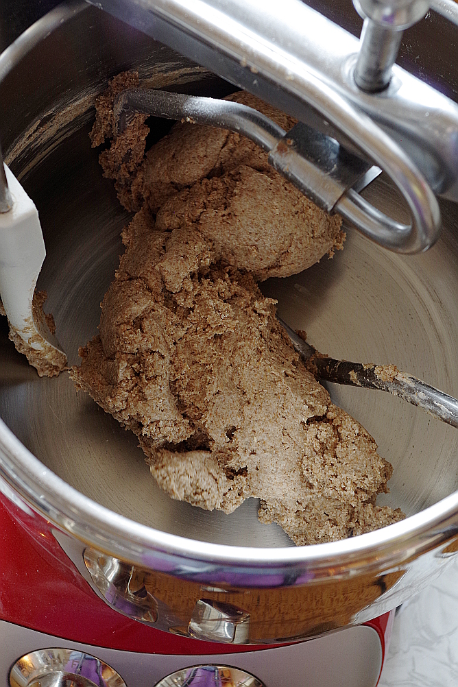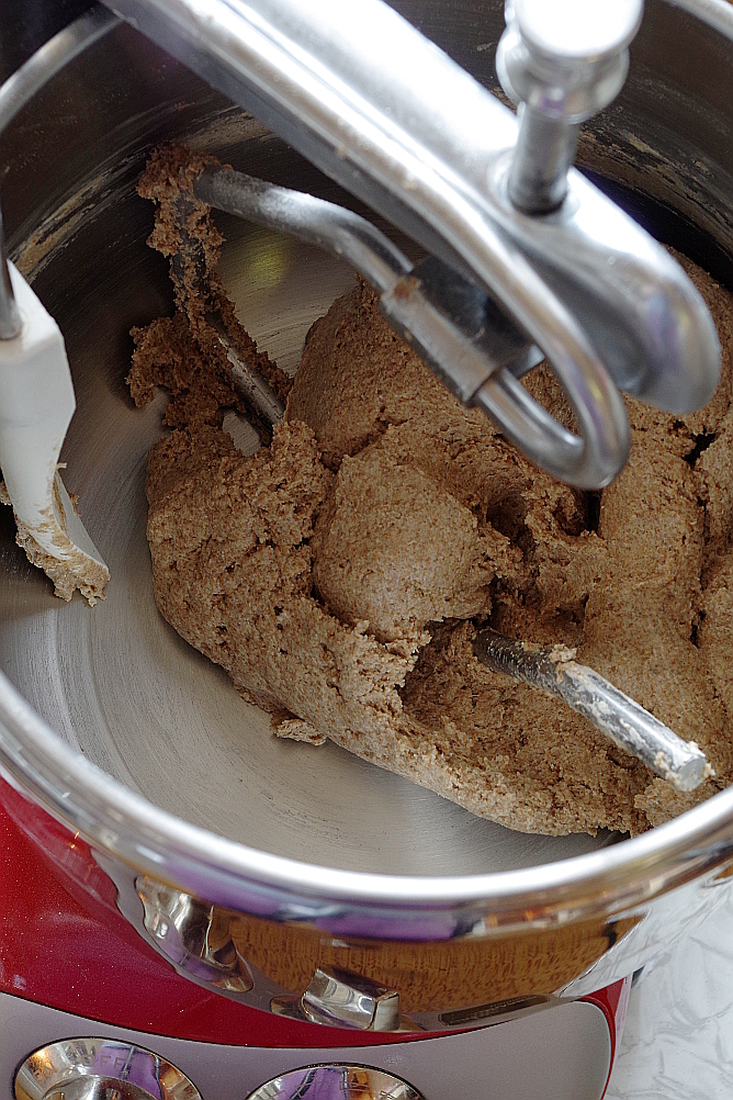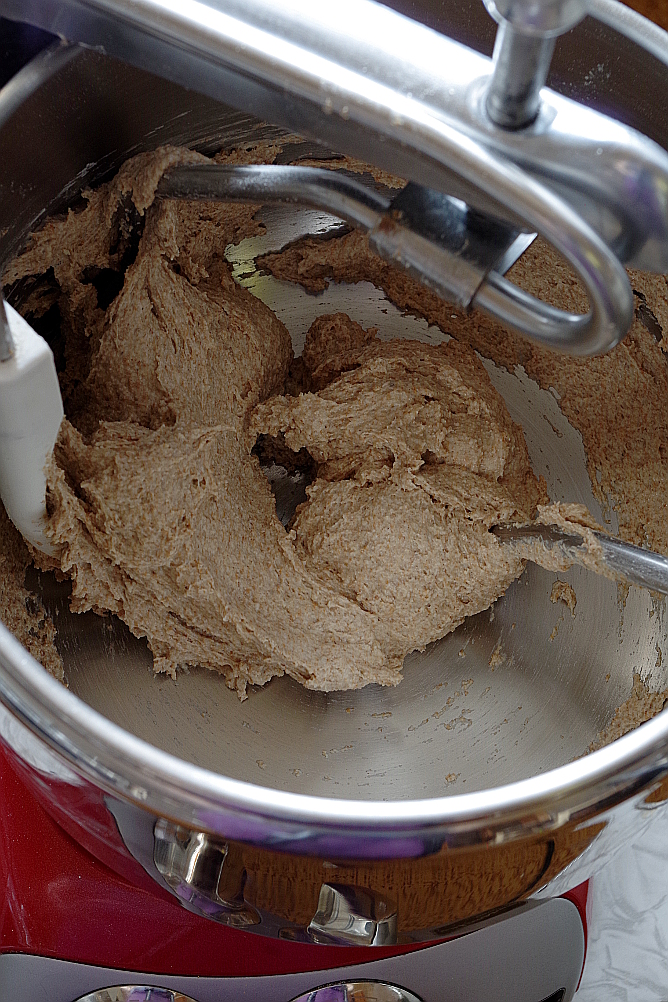 Если ржаной муки в тесте еще больше — от 70 до 90%, Хамельман советует замешивать 4 минуты на первой скорости или 2 минуты на второй. Густое ржаное тесто замешивать действительно трудно, по кокнситенции оно может напоминать глину или замазку, поэтому никому не советую замешивать его руками)) Это и тяжело, и руки потом трудно отмывать. Конечно, я и такое тесто замесила в своем тестомесе. Тут 80% свежей ржаной жерновой муки и 20% пшеничной цельнозерновой. В готовом хлебе вы ее в ряд ли почувствуете :) Вот тесто в начале замеса, а вот оно через 10 минут на второй скорости. Оно очень густое, поэтому иногда приходилось помогать скребком, тесто получилось вот такой консистенции: