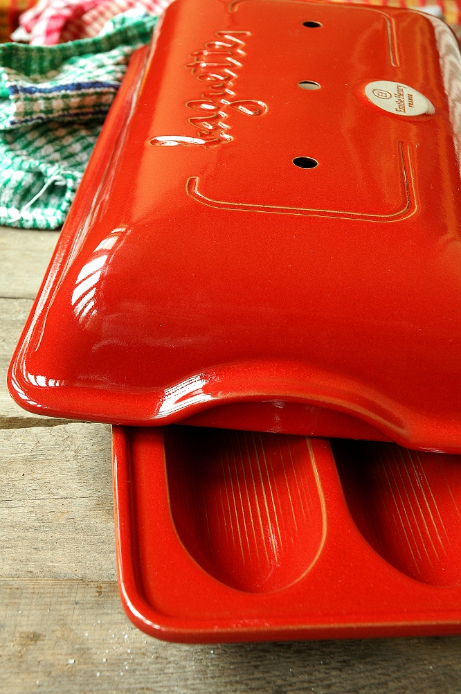 Это я пожаловалась. А теперь похвастаюсь)) Мечты сбываются и теперь я пеку багеты, и они получаются с каждым разом все лучше и краше! Как только увидела эту керамическую форму, поняла, что она должна быть моей, мы созданы друг для друга, и вообще, это то, чего мне так не хватало для багетной идиллии. И вообще, она очень грамотно и качественносделана — все прочно, красиво и ничего лишнего. Она состоит из поддона с тремя длинными выемками для багетных заготовок и крышки с ручками и отверстиями для выхода пара. Обе ее части керамические, покрітіе глазурью, и довольно толстые, это значит, что разогревать ее нужно всю целиком и достаточно долго, не менее получаса.