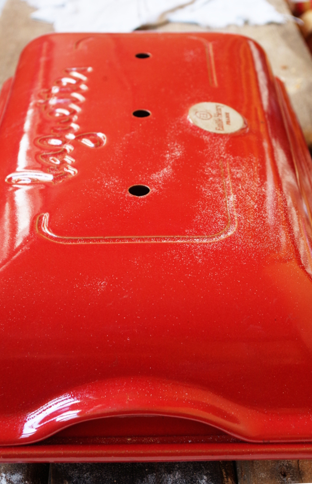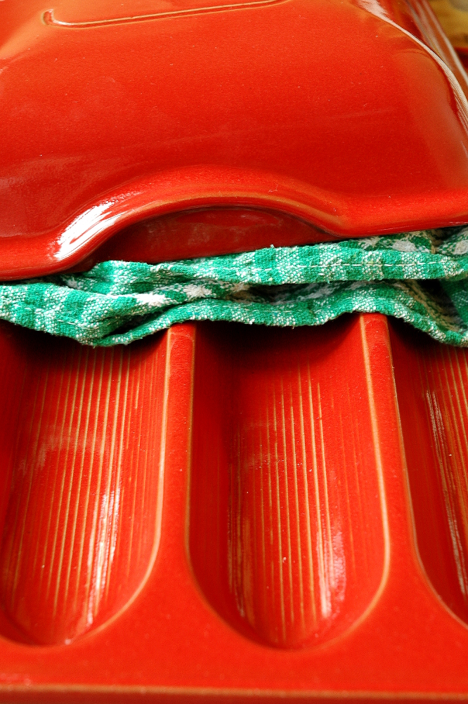 Как в ней печь? Обычно, пользуясь колпаком, мы оставляем его в духовке с хлебом 10, максимум, 15 минут, если держать дольше, возникнет «перепар» - избыток увлажнения, в результате чего корка у хлеба получится глянцевой, надрезы гладкими. В случае с формой можно не спешить и, по идее, печь хлеб от и до, не поднимая крышки, потому что на ее поверхности есть специальные отверстия для выхода пара. Но я, честно говоря, до сих пор не отважилась на такое и каждый раз минут через 20-25 вынимаю крышку формы и допекаю багеты без нее. Храню я это чудо в фирменой картонной коробке, да, форма немаленькая, но и не огромная, все-таки, для багетов, а не для каких-нибудь бутербродных булочек. Перед использованием протираю, ставлю на решетку духовки и включаю газ. Кстати, раскаляясь, форма меняет свой цвет и становится темнее, а, остывая, снова возвращает свой привычный ярко-красный цвет.