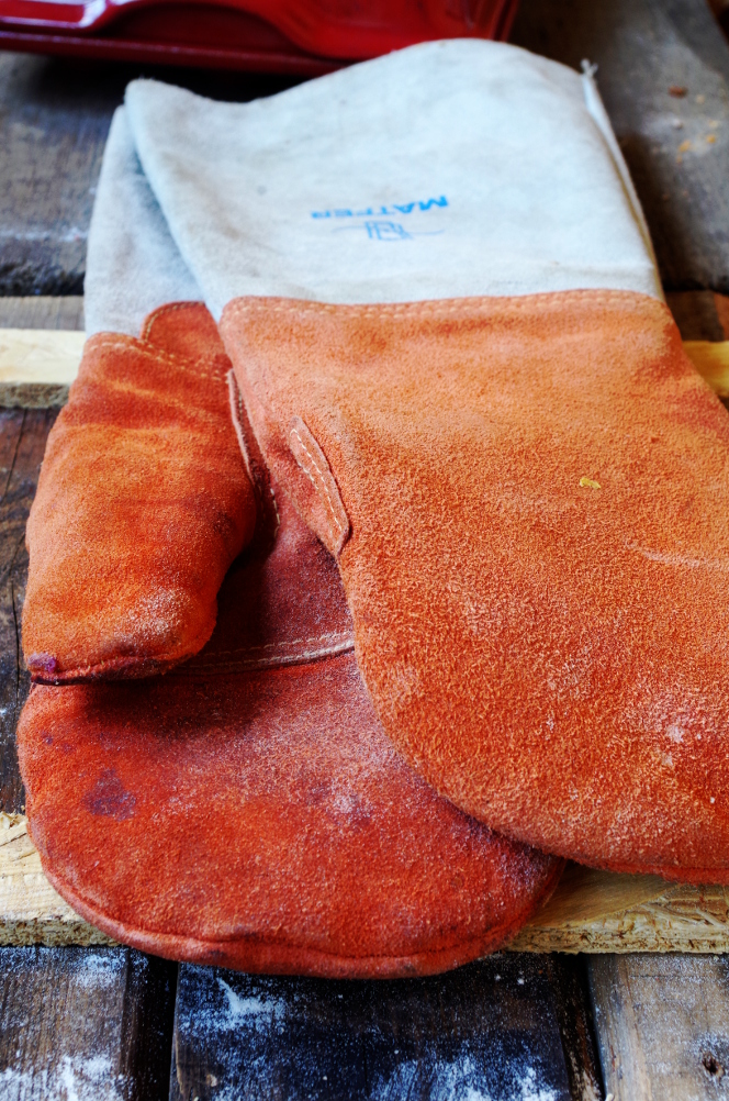 Как я писала выше, ее нужно разогревать заранее вместе с духовкой, а это требует определенной подготовки и отлаженных действий, потому что речь идет о раскаленной керамической форме. Очень желательно заранее приготовить по-настоящему хорошие рукавицы, у меня вот такие, огромные, прям выше локтя, и вы не представляете, сколько раз они меня выручали! С ними я совершенно без страха берусь за любые раскаленные предметы и, если бы еще немного ловкости, могла бы ими жонглировать.