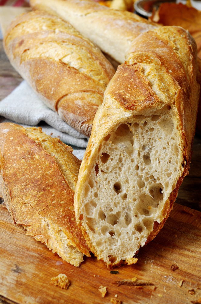 Ни разу толком не пекла багетов, было несколько сомнительных попыток, ничего интересного не получалось и я оставила эту затею. Во-первых, почему-то тесто не подходило, во-вторых, не получалось организовать нормальный пар, в результате чего я имела на выходе деревянную корку и деревянный мякиш. В какой-то момент я оставила попытки испечь нормальные багеты, в любом случае, для меня это было не реальным хотя бы потому что багеты были длинными, практически на весь противень, и увлажнить их в начале выпечки не представлялось возможным. Под круглую миску они не влазили, а от сковородки с водой на дне духовки толку не было, весь пар моментально улетучивался. Но мечта испечь красивые румяные, остроносые, с золотистой звонкой коркой и ноздреватым мякишем багеты периодически мелькала в моей голове, о таком ведь невозможно не мечтать!