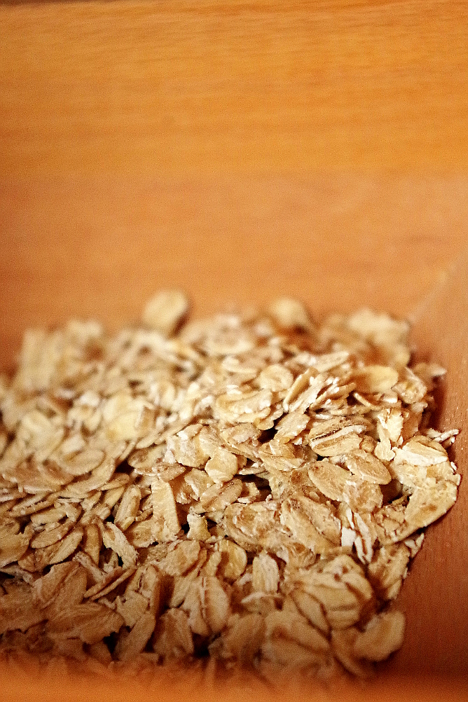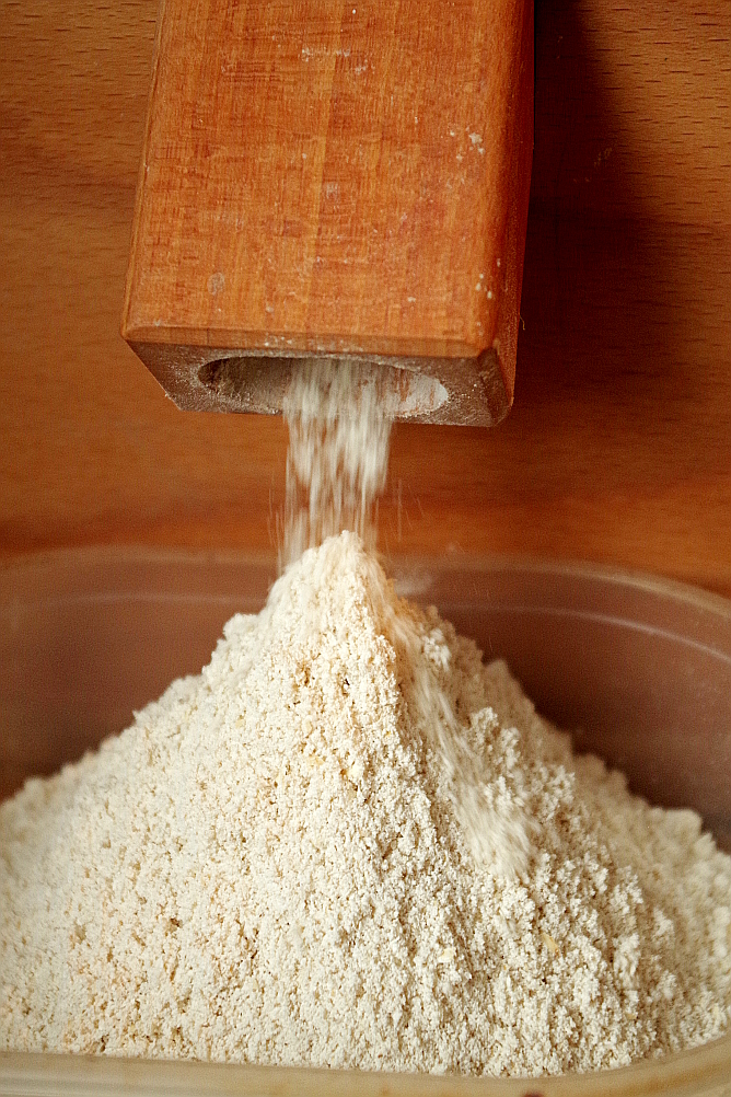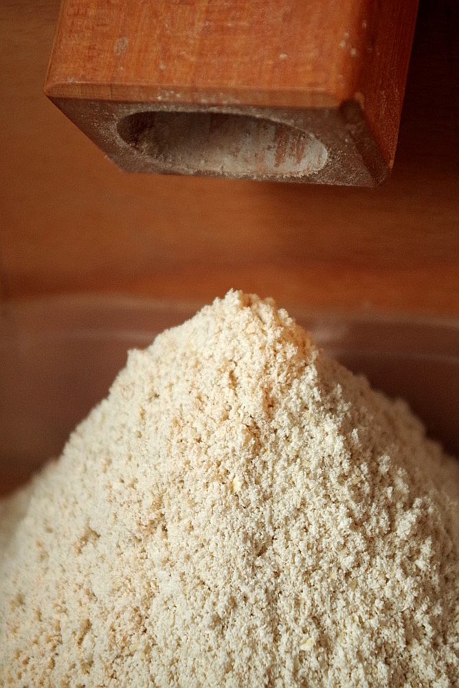 По рецепту в этот хлеб идет 100 гр. овсяной муки, у меня как раз была вкусная немецкая овсянка, которую я решила смолоть в своей мельнице. На самом деле, молоть в ней овсянку не желательно, жернова могут забиться и я до этого не рисковала, но после того, как люди в ней сушеную крапиву и ромашку мололи, я решила попробовать! Взвесила 100 гр., засыпала в бункер, включила, мульница зажужжала, жернова завертелись, но ничего не произошло, мука не посыпалась. Меняла положение рычага, стучала по носику (очень умно с моей стороны), - ноль реакции. По звуку поняла жерновов (как будто крутятся впустую) я подумала, что хлопья просто к ним не смогли просыпаться из бункера. Та к и было: хлопья лежали на месте, а жернова крутились просто так. Деревянной вилкой пошевелила хлопья, пытаясь затолкать их к жерновам, рычаг перевела с «единички» на «тройку», и посыпалась свеженькая овсяная мука! Все время, что мололись хлопья, мне приходилось помогать им падать внуть вельницы к жерновам, проталквая и перемешивая их деревянной вилкой. Вот что у меня получилось!