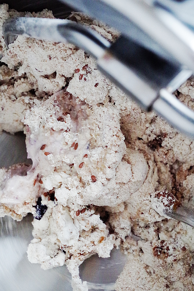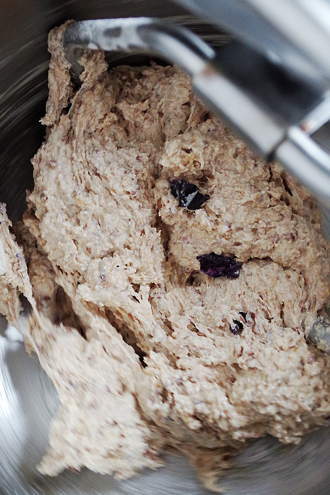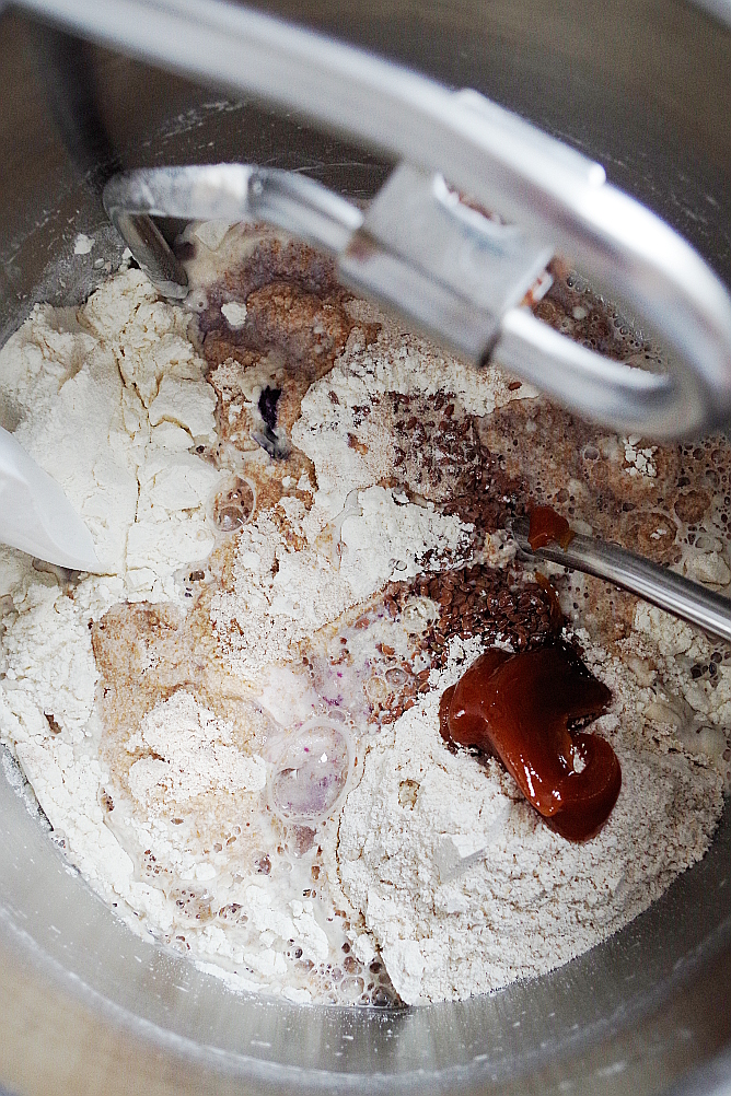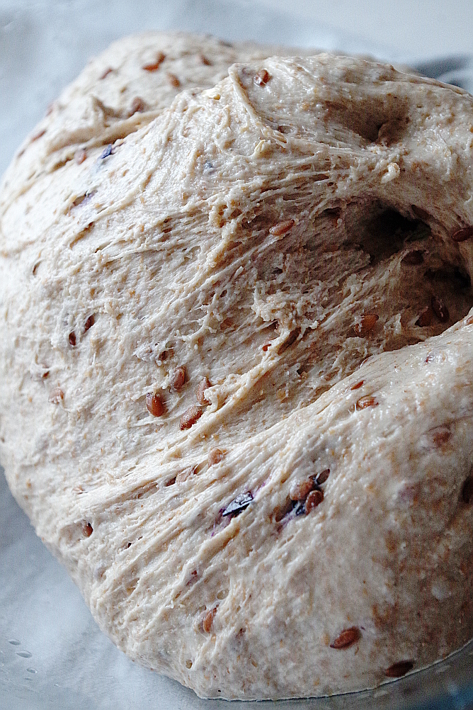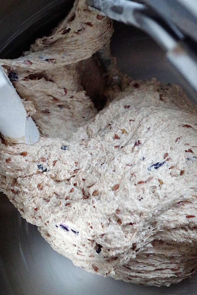 Замешивала, как всегда, в Анкарсруме, использовала крюк. Сначала сложила все ингредиенты, кроме масла и соли, в дежу, на минимальной скорости перемешала до однородности и оставила на 20 минут для аутолиза (дежу накрыла пакетом, чтоб тесто не сохло).