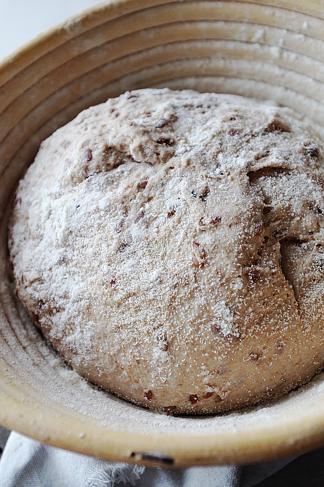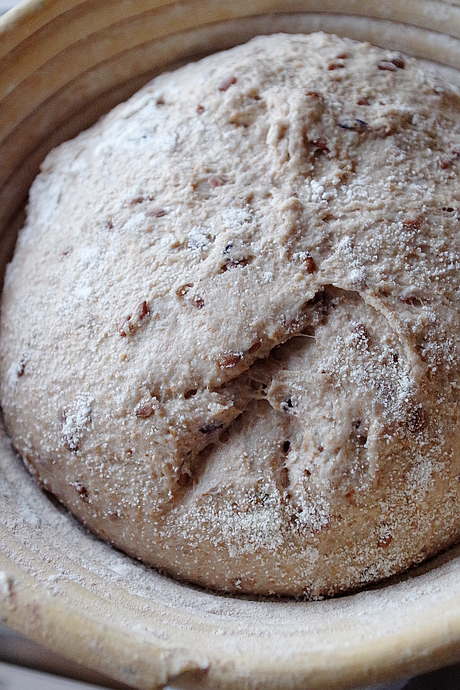 Потом свернула тесто в шарик, тем самым обмяв его, дала полежать 5-7 минут, еще раз свернула и уложила в круглую корзинку, посыпанную манкой. Расстойка чуть более полутора часов. Примерно за час до начала выпчеки включила духовку разогреваться месте с камнем (температура — максимум, для моей духовки это около 250 градусов).