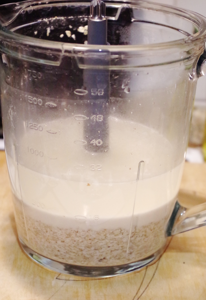 Я смешиваю все прямо в чаше блендера, чтобы не заморачиваться с лишней посудой. Высыпаю овсянку в чашу, добавляю закваску и немного меда, заливаю водой, вжикаю пару раз, чтоб закваска полностью разошлась и оставляю при комнатной темепратуре на 8-10 часов. Очень удобно все это смешивать вечером, перед сном, чтобы утром буквально в считанные секунды все было готово. За ночь овсянка хорошо пропитывается водой и сильно набухает, ее полезные свойства и витамины переходят в воду, плюс она ферментируется, плодятся и размножаются благотворные молочно-кислые бактерии.