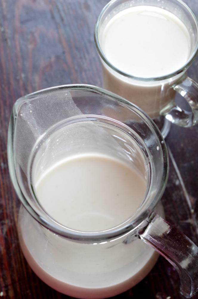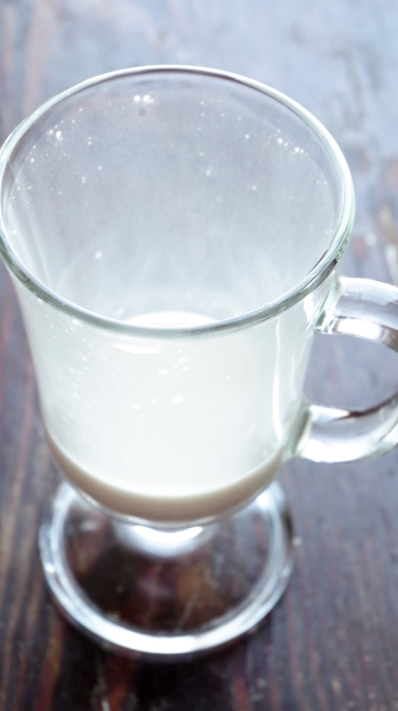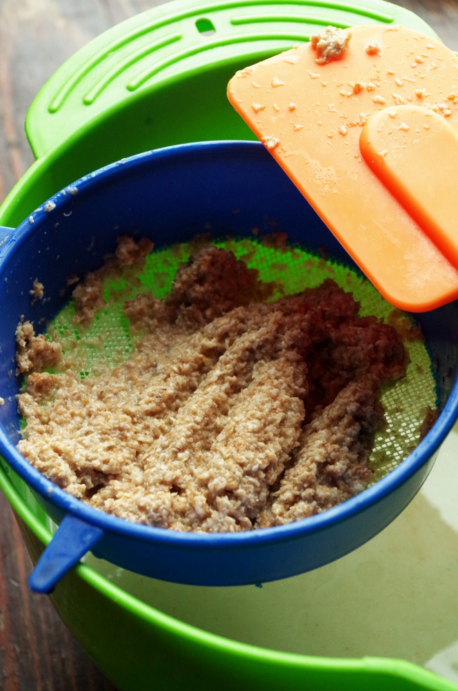 Утром овсяная водичка выглядит бодро и с пузырями на поверхности. Добавляю мед (и иногда корицу), вжикаю ее еще раз блендером, чтобы максимально разбить и смешать овсянку с водой и процеживаю через сито. В сите остается вот такой овсяный жмых — остатки плющенного зерна и отруби. Получившуюся жидкость молочного цвета переливаю в кувшин, а оттуда уже разливаю по чашкам.