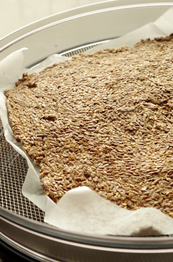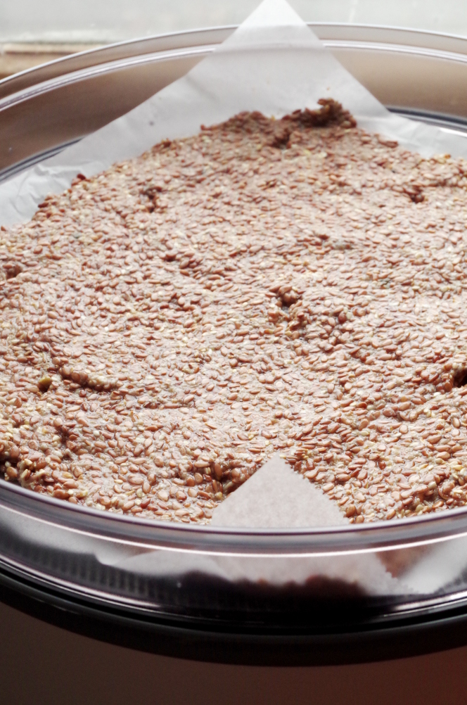 В общем-то, эти хлебцы можно делать и в духовке, если она у вас может выдавать и равномерно удерживать невысокую температуру. Сушилка же позволяет совершенно надежно готовить эти хлебцы при температуре не выше 70 градусов, а это очень важно для льна. Все знают, что лен богат маслом, которое ,в свою очередь, богато незаменимыми жирными кислотами. В льняном масле просто уйма омег, в особенности омеги-3, поэтому его запах напоминает запах рыбы (в рыбе же рыбий жиииир с этими омегами). Эти жирные кислоты очень подвержены разрушению, они начинают разлагаться на вредные вещества от нагрева выше 70 градусов. Потому льняное масло в магазинах очень часто бывает горьким: долго стоит на полках в ненадлежащих условиях и успевает испортиться, прогоркнуть. Лен тоже относительно быстро портится. Несвежие семена имеют затхлый не прятный запах и вкус, который очень быстро распознается.