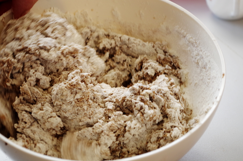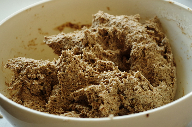 - Смешайте закваску и заварку, перемешайте и добавьте воду. Всыпьте всю муку и перемешайте до однородности и полного увлажнения муки. Накройте пленкой и оставьте на 15-20 минут для аутолиза.