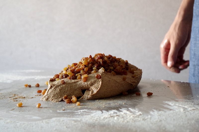 - Достаньте тесто из миски, внесите соль и продолжите замес, в процессе внесите мед, а, когда тесто станет гладким - сливочное масло и в самом конце - изюм. Как это делается, вы можете посмотреть на видео (работа пекаря в замедленном режиме))