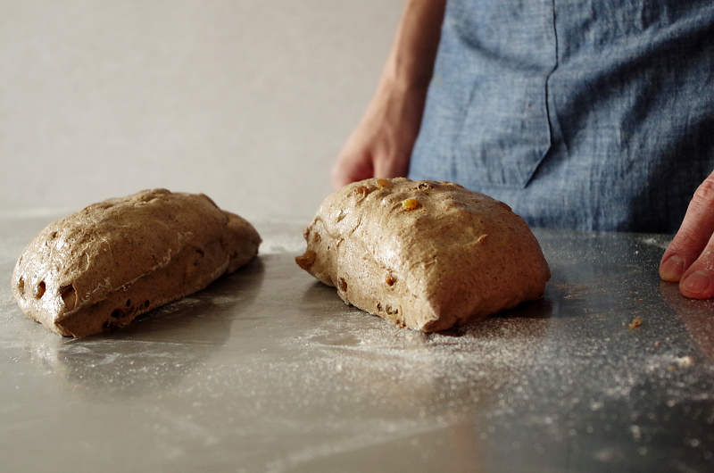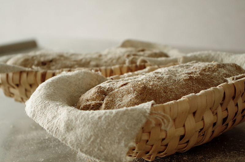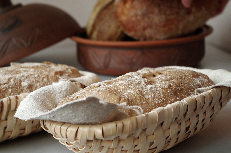 - Сформуйте овальные заготовки и уложите в корзинки, присыпанные мукой, швом вверх. У нас тут плетеные из орешника, которые надо обязательно застилать тканью, если у вас будут корзинки из ротанга, застилать не обязательно, а еще красивые полоски на хлебе получатся!) Вообще, если вы посмотрите на видео, заметите, что из привычных инструментов у нас только скребок, остальное - подручное: треснувший шамотный камень, который Артур притащил из дома, картонка вместо лопаты, просто лезвие, не самый острый хлебный нож :)