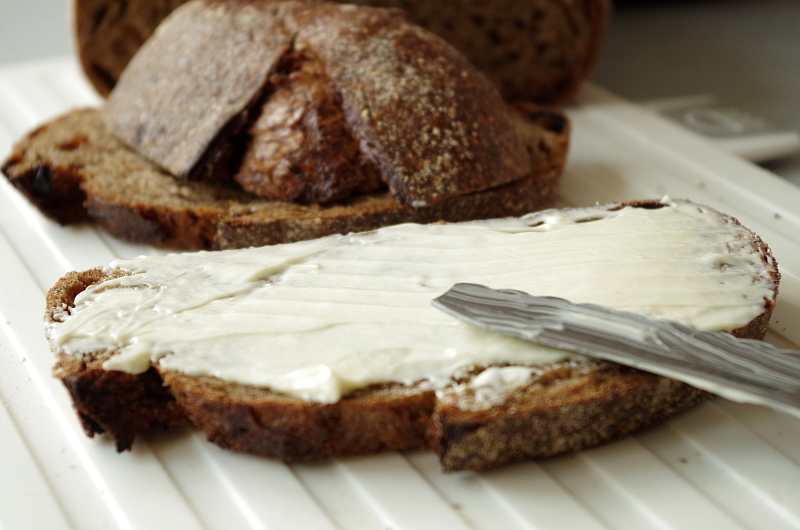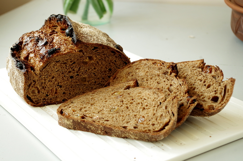 Про технологию и вкус. Особенность этого хлеба в применении ржаной закваски и заварки из солода и ржаной цельнозерновой муки, которая придает особую структуру и мягкость готовому изделию и значительно замедляет черствение. Очень здорово в нем раскрывается легкая медовая сладость, кислинка сухофруктов и мягкий аромат сливочного масла. Несмотря на использование ржаной цельнозерновой муки, хлеб получается совершенно деликатным, который можно отнести к десертным видам. Со сливочным маслом к чаю, или с сырами к красному вину - идеально!) Или вообще просто так!