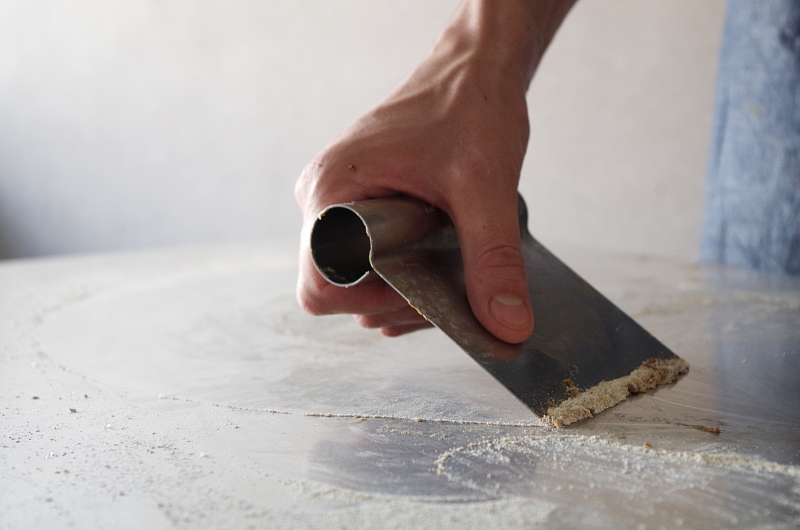 - Через 40 минут выложите тесто на слегка присыпанный мукой стол, разровняйте и, растягивая края, сложите его конвертом, потом затяните в тугой шар и верните в миску.