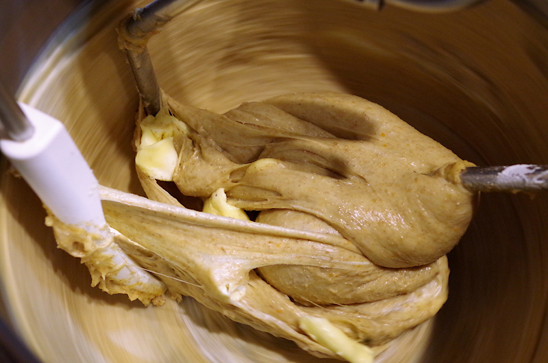 - Смешайте все ингредиенты, кроме сахара, соли и масла, начните активный замес, добавьте соль. Когда тесто начнет становиться гладким, начните вносить сахар - порционно в 3-4 захода.