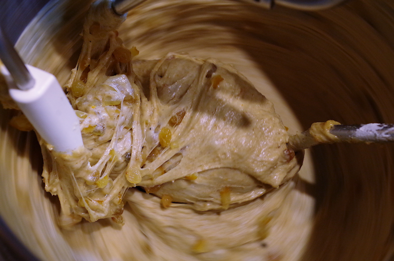 - В самом конце замеса на 1й скорости тестомеса внесите подготовленный изюм и цукаты. Общее время замеса в тестомесе Ankarsrum на 2 скорости - около 40 мин.