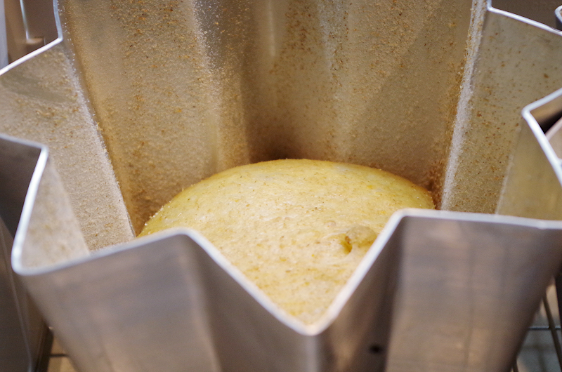 - Разложите по формам, заполнив примерно ⅓ формы. А формы предварительно проткните бамбуковыми шампурами, чтоб подвесить панеттоне после выпечки. Форму для пандоро смажьте сливочным маслом и присыпьте мукой, а потом уложите тесто.