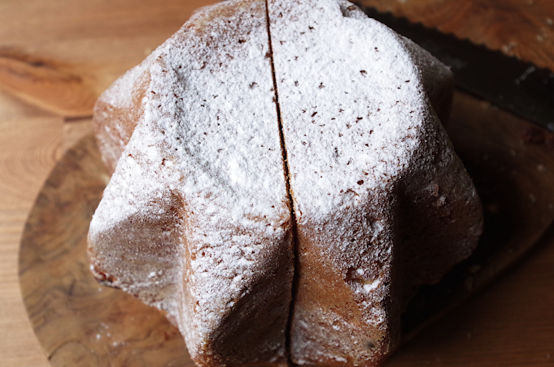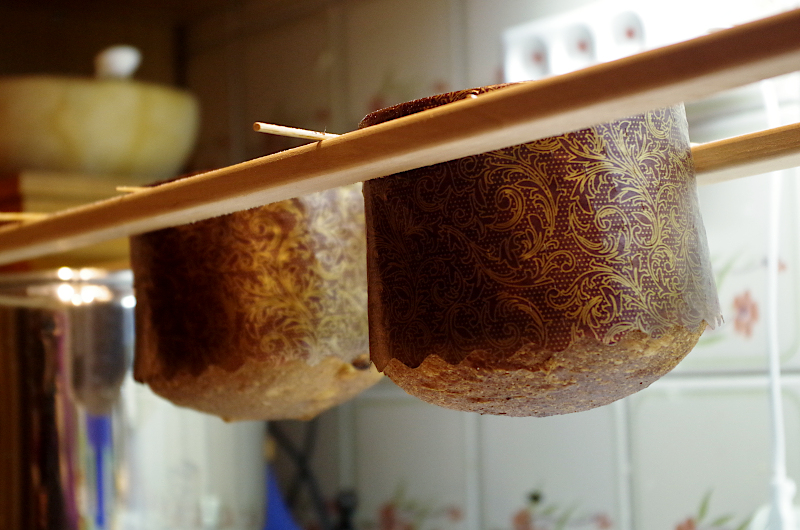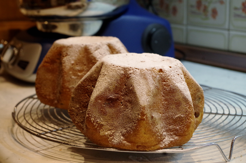 - Готовый панеттоне подвесьте вверх дном, а пандоро остудите на решетке, посыпав пудрой. Прикол тут в том, что панеттоне - крайне нежное и воздушное изделие и благодаря особенностям выпечки, получаестя вообще на пределе нежности. Если вы такую булочку поставите или положите, она согнется под собственным весом, а, если подвесите, то вытянется и станет еще шикарнее! Но, если вы месили тесто и оно было слабым и липким, а изделие получилось плотным, можно не заморачиваться - там нечему вытягиваться))