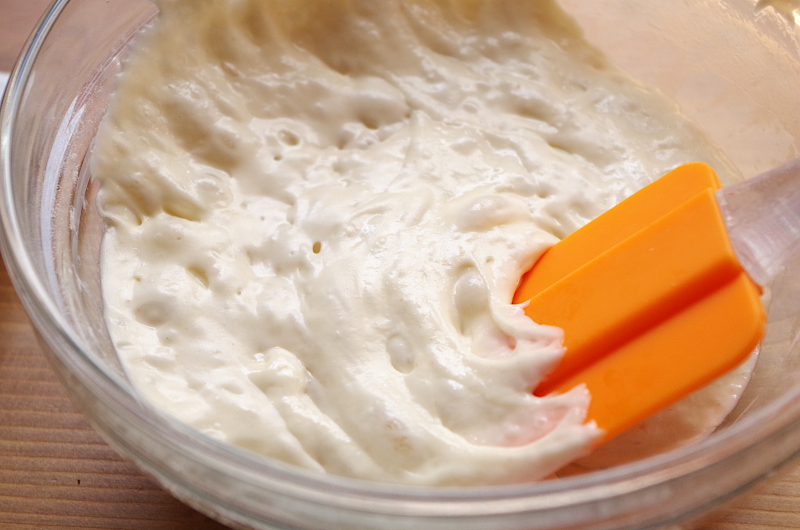 - Сложите % муки (100%) и воды.