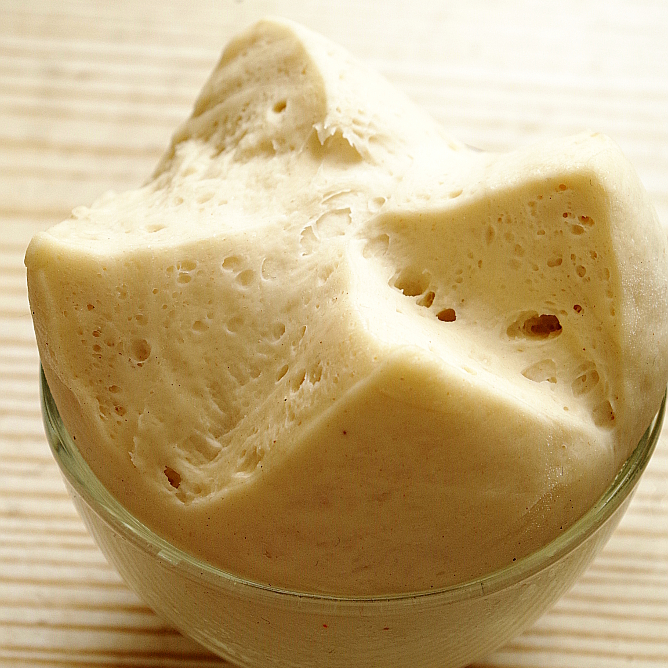 В 10 гр. закваски влажностью 60% (влажность моей закваски) 6,25 гр. муки и 3,75 гр. воды (плюс-минус, понимаете)).