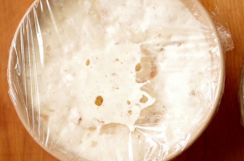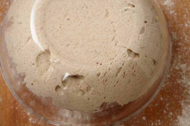 Брожение около 2,5 часов с одним складыванием через 40-50 минут от начала брожения. Во время ферментации тесто должно хорошо увеличиться в объеме и стать пористым. Чтобы увидеть это, желательно использовать посуду с прозрачными стенками.