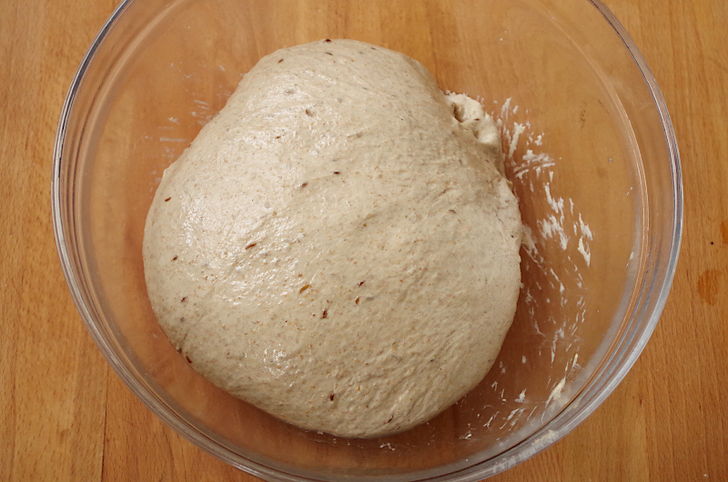 После аутолиза внесите соль и тмин и начните активный замес. Если месите в таком же тестомесе, как у меня, то это около 20 минут на второй скорости Продолжительность замеса очень зависит от муки, если у вас слабая мука, то скорость 1-1,5, время замеса 15 минут, если в спиральнике, то вдвое короче и скорость не больше второй. Если замешиваете руками, то техника отбивания для этого теста подойдет лучше всего.