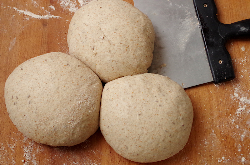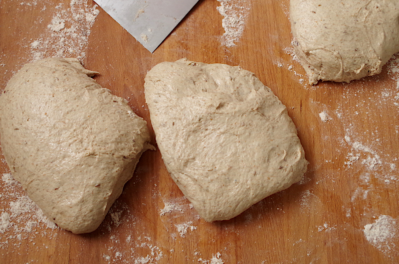 Разделите скребком на три примерно одинаковых куска (или на весах по 575 гр.)Каждый подкатайте в шар (округлите) и дайте 15-20 минут отлежаться, подпыла тут - минимум или вообще без.