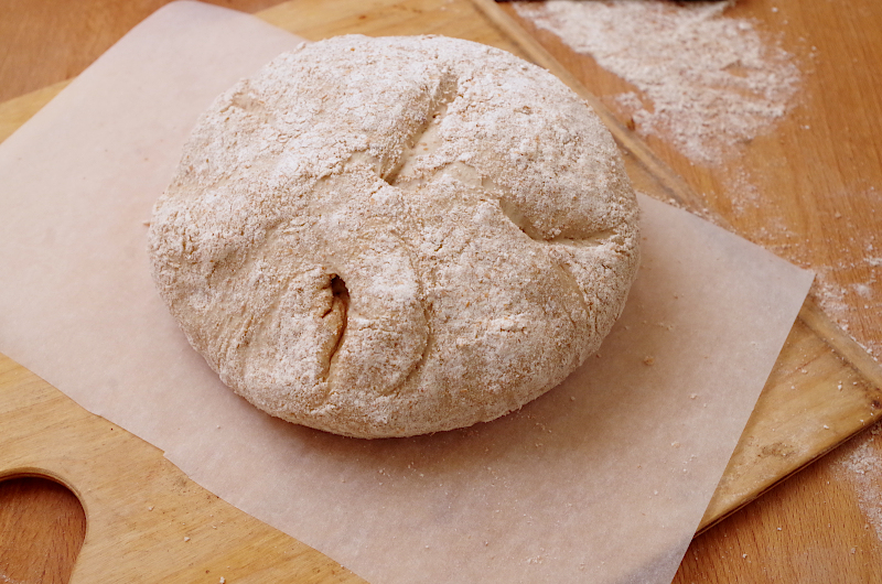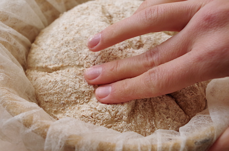 Формовка: подпылите стол, переверните тесто гладкой верхушкой вниз, сформуте круглую заготовку, растягивая и заминай края к серединке, но при этом не продавливая центр. Добавьте на стол еще муки и прокатайте по этой муке заготовку швом вниз. Обычно мы делаем все наоборот - всю муку убираем, добиваемся легкого прилипания теста к столешнице и затягиваем его в тугой шар. Сегодня у нас другая задача - запылить шов мукой, чтобы он не слипся и красиво раскрылся в процессе выпечки, потому что надрезать заготовку мы не будем. Уложите тесто швом вверх в круглую корзинку, присыпанную мукой (диаметр 19-22 см. примерно), накройте, чтоб тесто не заветрилось.