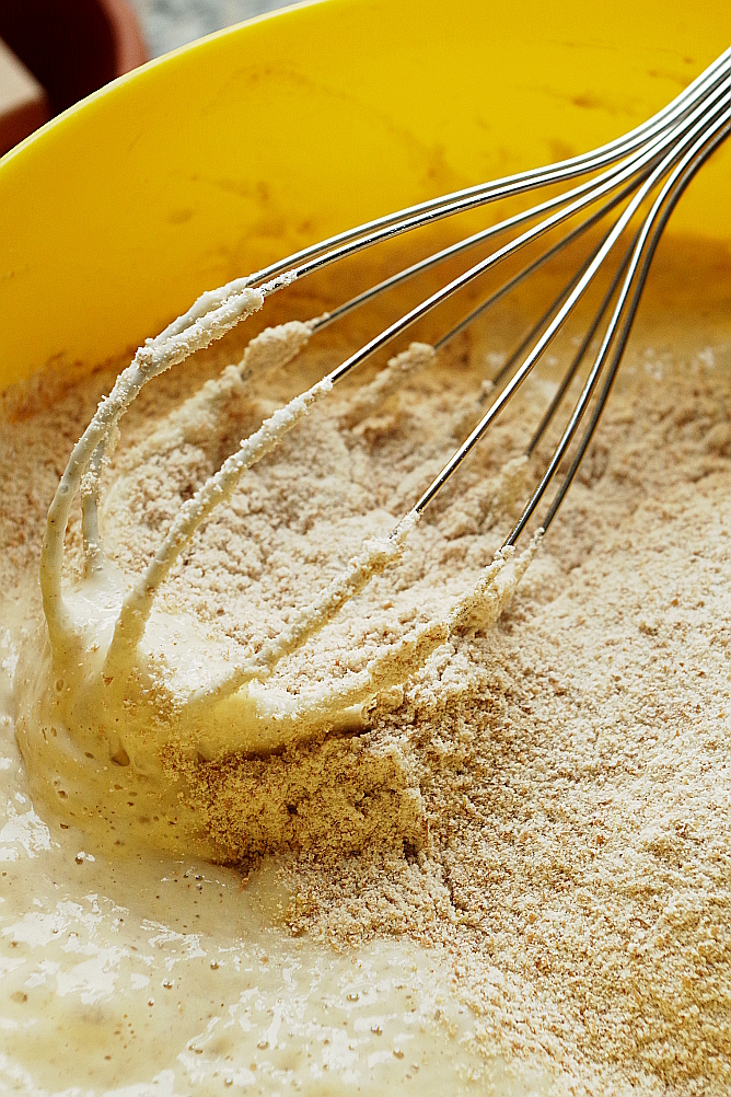 К созревшей закваске добавляем муку, соль и соду, масло, перемешиваем.