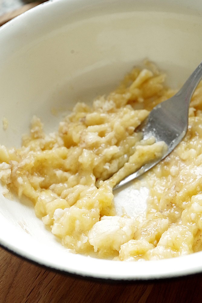 Яблоко очищаем от сердцевинки и трем на терке, банан очищаем и мнем вилкой.