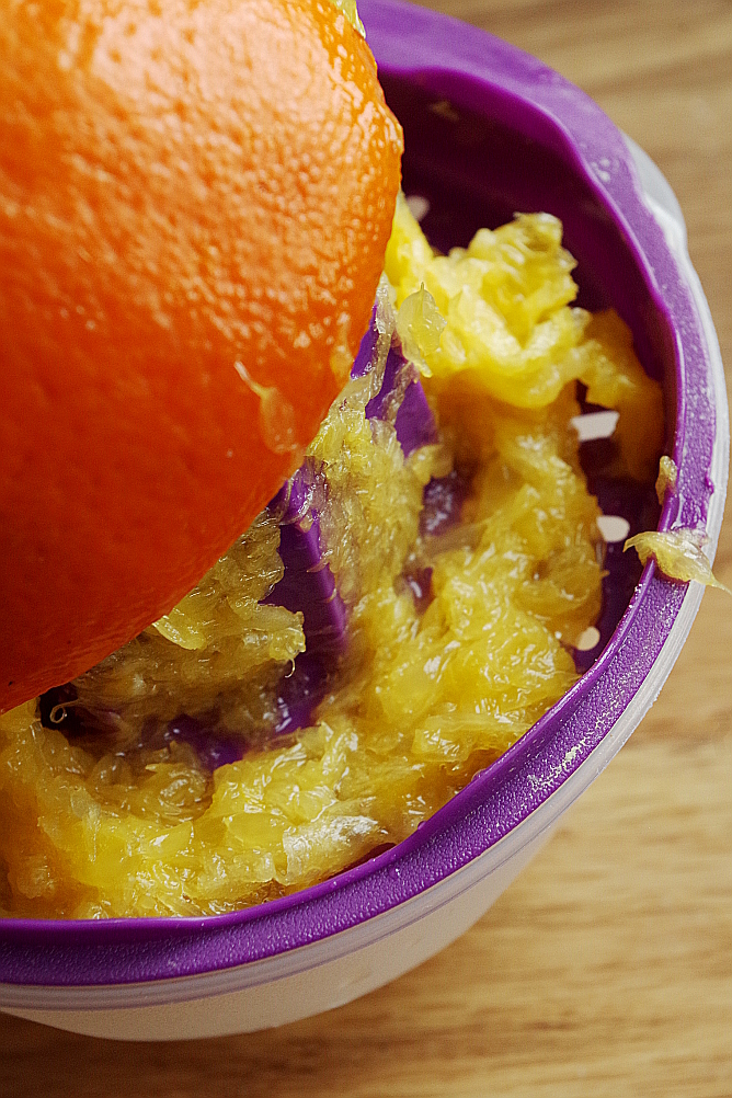 Давим сок из апельсинов и добавляем все подготовленные фрукты в тесто.