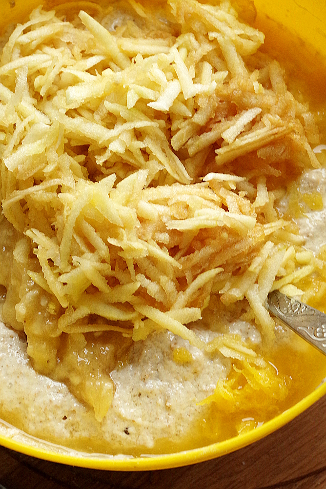 Тесто для этих оладий готовится на закваске и соде, средней консистенции, но, если добавить жидкости, получится более влажное тесто, подходящее для блинов. Все очень просто: