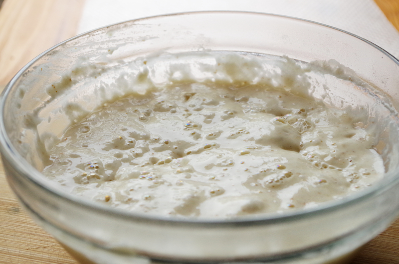 Смешайте, оставьте на 12-14 часов при 23-24°. Закваска должна хорошо созреть, увеличиться в объеме, стать пышной, ароматной и начать проседать в серединке.