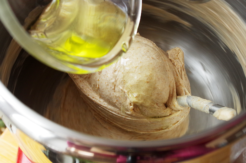 После сахара в два этапа внесите растительное масло, каждый раз давая ему хорошо разойтись в тесте. При этом лучше помогать тестомесу руками, чтоб масло быстрее соединилось с тестом.