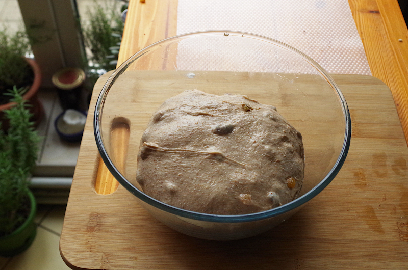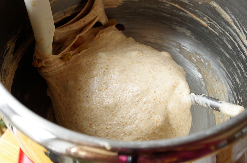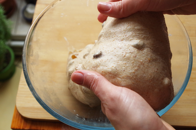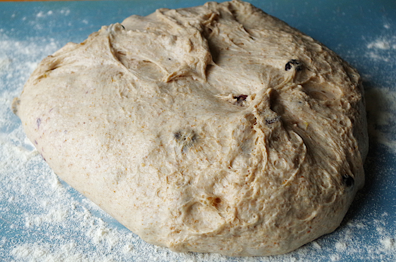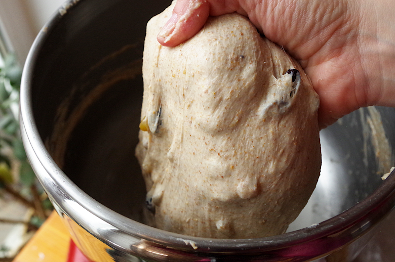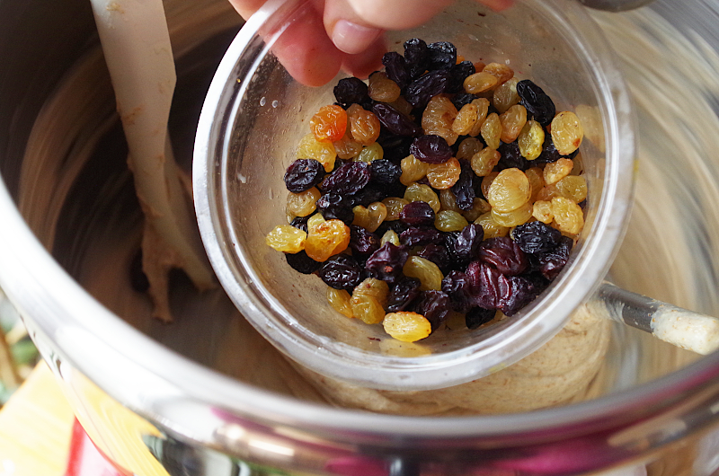 Домесите до гладкости и эластичности, внесите сухофрукты, остановите замес.
