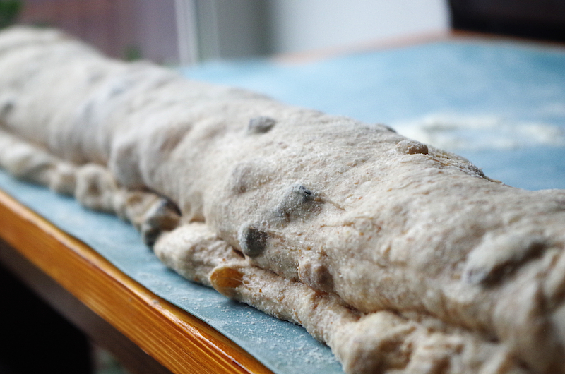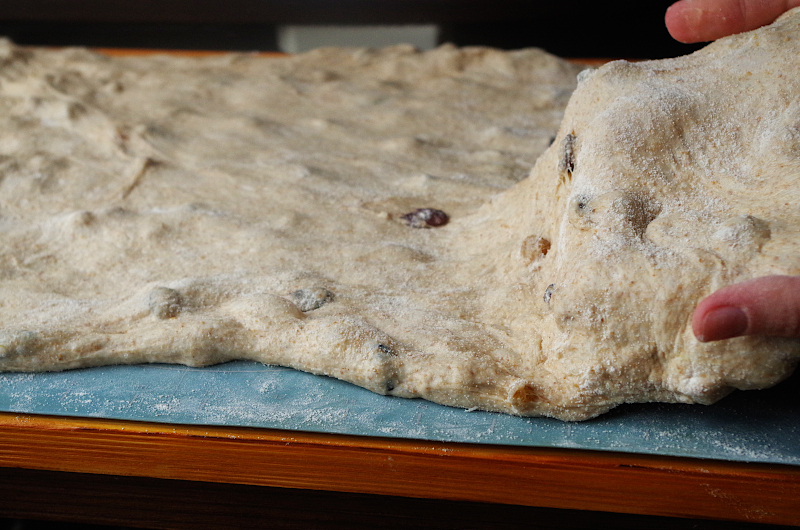 Подошедшее тесто выложите на стол или силиконовый коврик, присыпанный мукой (у меня коврик с застежкой Joseph& Joseph, очень удобный, к нему почти не липнет тесто и стол остается чистым). Если у вас, как и у меня, тесто получилось мягким и эластичным, не используйте скалку, просто присыпьте мукой и равномерно растяните его в стороны руками, должен получиться более-менее равномерный по толщине прямоугольник.