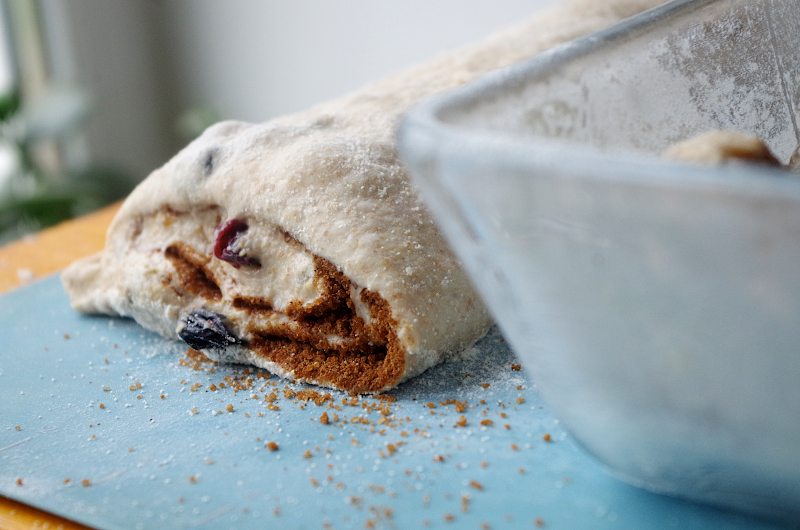 Аккуратно сверните тесто рулетом, начиная с широкой стороны прямоугольника.