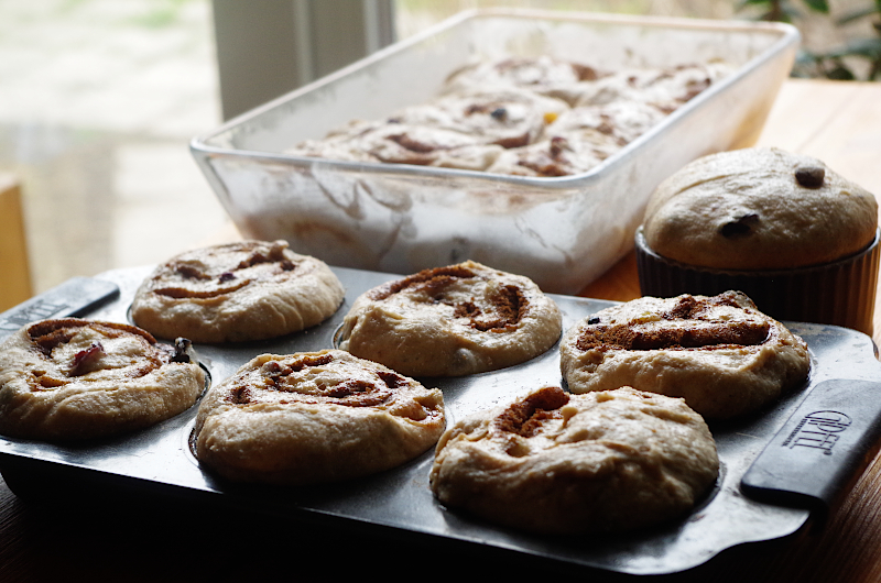 Специально для тех любителей сдобных булок, кто везде пытается снизить калорийность, жирность, выбросить из сдобы яйца или сливочное масло, заменить муку на цельнозерновую, а белый сахар на коричневый. Постное картофельное тесто (ничего же, что здесь картошка?), которое можно использовать для булочек, пирожков, синнабонов и вообще чего угодно, тесто универсальное! Картофельное пюре делает это тесто нежным и мягким, но привносит определенный эффект неопределенности в консистенцию, поэтому с жидкостью осторожнее. Картошка бывает разной по влагоемкости, как и мука, поэтому добавляйте жидкость при замесе не всю сразу, а постепенно, доводя тесто до мягкого густого состояния, а по мере замеса картошка будет делать его мягче. Вы можете брать любое растительное масло, можете увеличивать процент цельнозерновой или наоборот брать меньше, увеличивая содержание белой, можете добавить в тесто изюм или клюкву (как у меня), можете орехи, все будет вкусно! Меня не отпускают синнабоны, поэтому испекла именно их :))