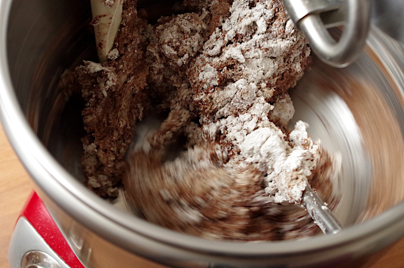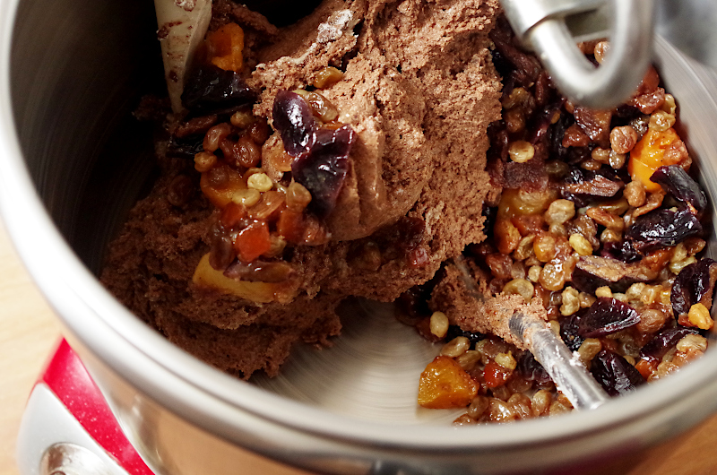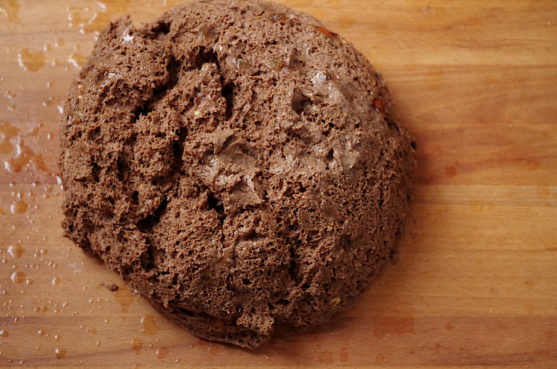 В тестомесе (только если у вас Ankarsrum, спиральные ржаное не очень умеют месить) смешайте все ингредиенты, кроме сухофруктов и орехов, когда тесто станет однородным, добавьте сухофрукты и орехи.