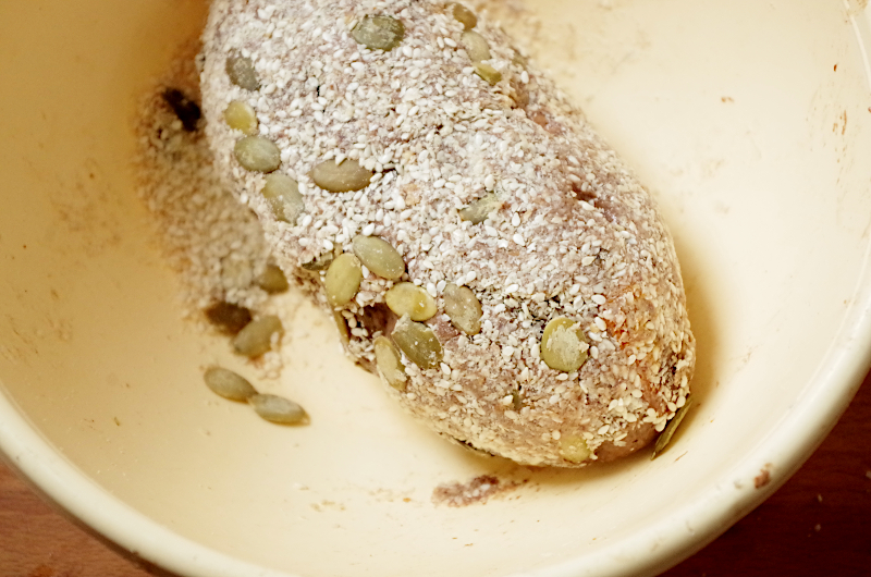 Каждый кусок аккуратно мокрыми руками превратите в аккуратную колбасу размерами, подходящими к выбранным формам, при желании обваляйте в семечках или посыпьте сверху заготовку в форме, потом мокрыми руками придавите семечки.