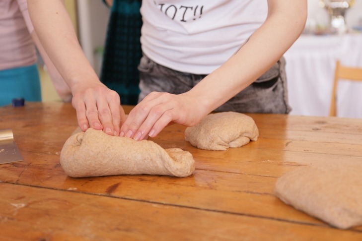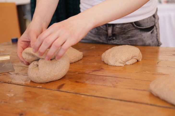 Округление должно происходить легко и быстро, буквально в несколько движений. На мастер-классах мы мучаем тесто долго, выдавливая в процессе практически все пузыри, но по-хорошему это должно происходить быстро и без ущерба для внутренней структуры теста. Скребком подденьте тесто и положите прямо перед собой на стол, присыпанный тонким слоем муки. Я практически всегда присыпаю стол цельнозерновой мукой, она не отсыревает так быстро, как мука более тонкого помола, практически не смешивается с тестом, а в процессе округления просто осыпается. Если вы имеете дело с тестом средней влажности, не жидким, как для чабатты, то уложите его гладкой стороной вниз. В результате ваших действий гладкая сторона окажется сверху ив последствии станет верхушкой хлеба. Если после брожения и в результате разделки появились слишком крупные пузыри – похлопайте по тесту ладонью: пузыри, которые образовались близко к поверхности, лопнут, а те, которые были внутри, разобьются на более мелкие. Слишком крупные пузыри тесту ни к чему, они могут приводить к образованию огромных пустот в хлебе, которые даже порами нельзя назвать, потому что они больше напоминают пещеры.