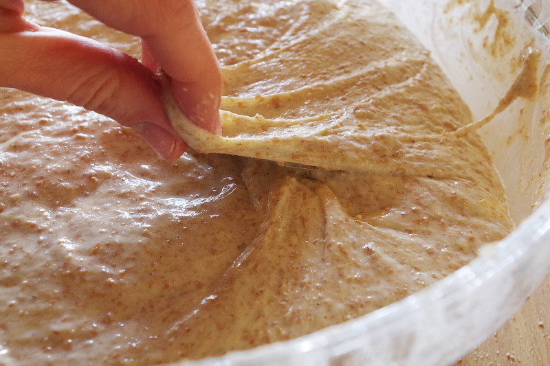 - Если вы просто недомесили тесто, не развили клейковину в достаточной степени (например, если замешивали просто складываниями, а не отбиванием и не в Ankarsrum Original, он для влажного теста идеален). Тесто в таком случае будет блестящим, рыхлым, липким, рвущимся, но может намного улучшить свои свойства в процессе последующих складываний или в процессе длительного холодного брожения. За 10 часов брожения в холоде клейковина и правда станет более эластичной и набухшей.