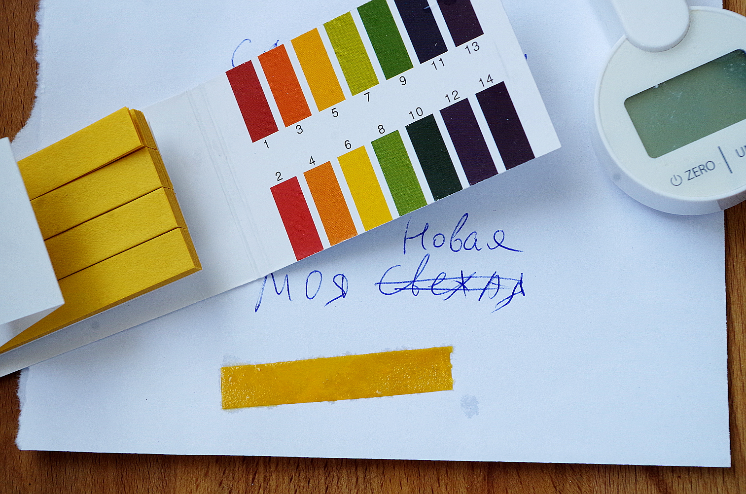 Определить, насколько кислые тесто и закваска, мы можем и без приборов и лабораторий, понюхав или попробовав на вкус, но это будет субъективная оценка, потому что мы все разные, и рецепторы на языке у нас отличаются, и ощущение вкуса и вкусовые привычки – тоже. Для достоверности обычно используют измерительные приборы: различные РН-метры, в крайнем случае, лакмусовую бумагу. У меня как раз такая под рукой оказалась.