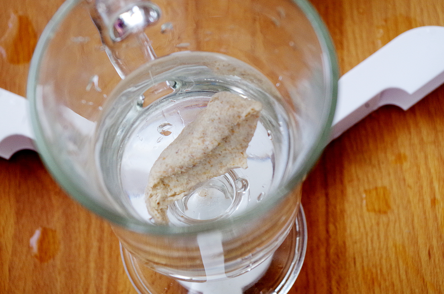 Также я решила измерить РН цельнозернового теста примерно в начале брожения и в конце. Поместила в стакан с 90 гр. воды 10 гр. теста, хорошенько разболтала-растерла и опустила бумагу. Она окрасилась в темно-желтый цвет с зеленоватым оттенком, я оцениваю результат как что-то среднее между 6 и 7.