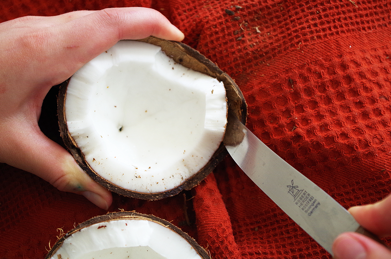 Вода, кстати, очень вкусная, чем-то напоминает березовый сок, только слаще. Ее можно просто выпить, она полезная. Далее ножом откололи от скорлупы кокосовую мякоть. Мы решили не счищать темный слой на поверхности мякоти, он вполне съедобен и особенно богат маслом.