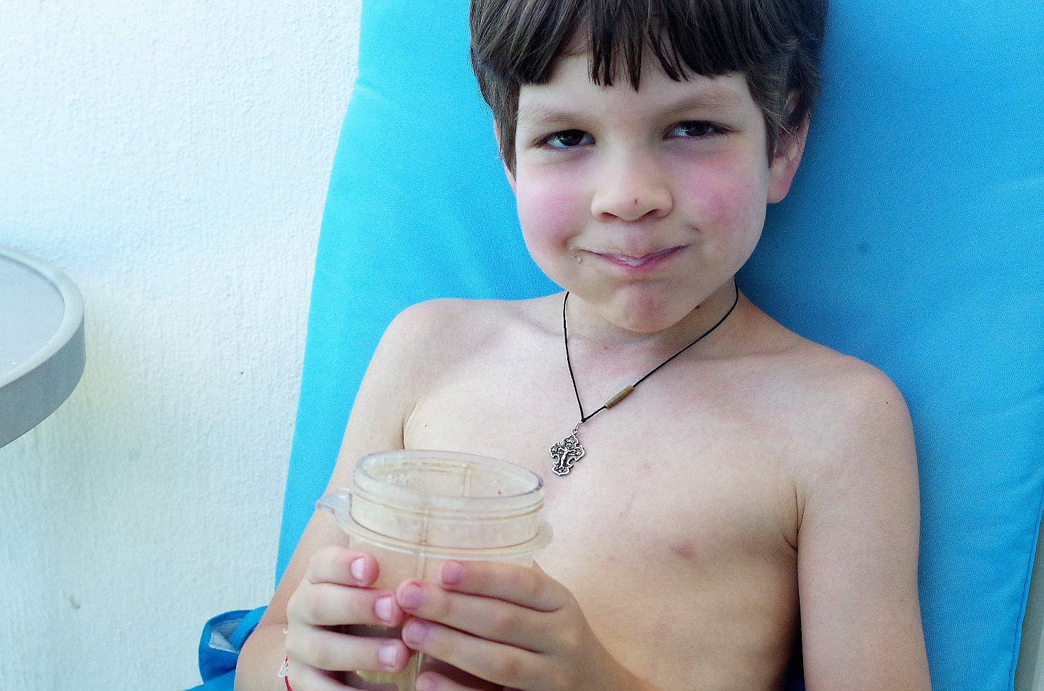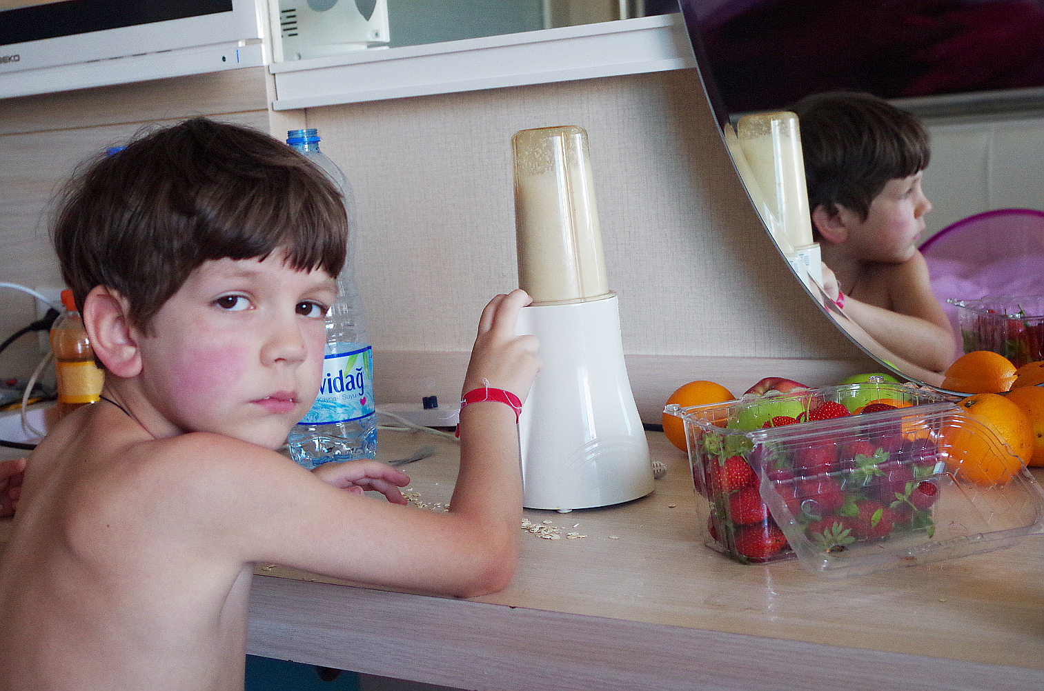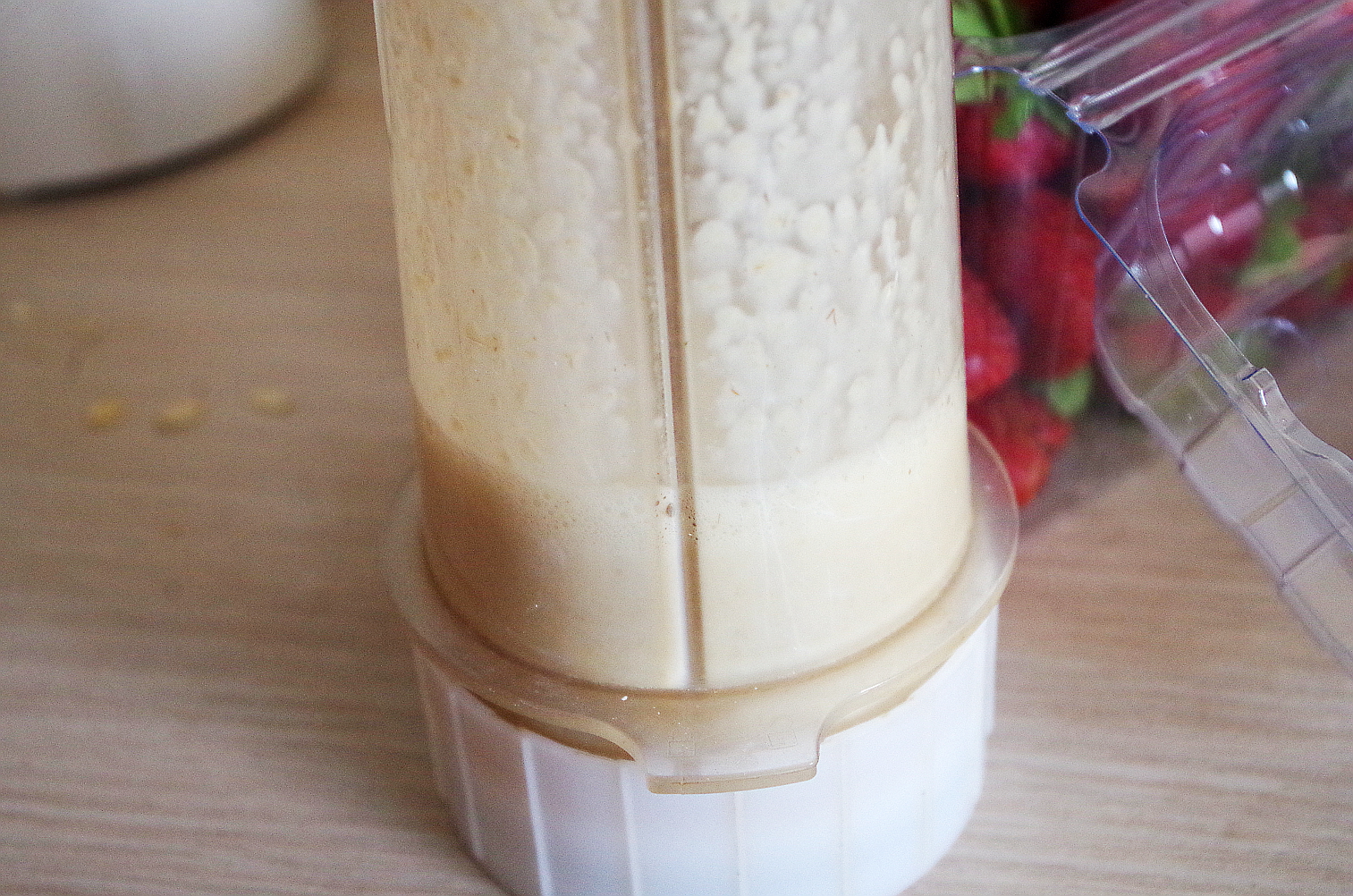 Продолжая тему растительного молока, хочу показать вам еще и овсяное. Его я делала уже в Турции в блендере Tribest, который повезла с собой на отдых, даже не я делала, а дети, а я снимала и дегустировала плоды их трудов. Тоже неплохая альтернатива обычному молоку, и прекрасная основа для коктейлей и смузи, делается очень просто: нужно засыпать в чашу блендера 2-3 ст.л. овсянки, добавить чашку воды, смолоть все в течение минуты, получится белая водичка, которая есть овсяное молоко. Ее можно дополнить медом, какао или кэробом, а можно бросить туда банан и клубнику и сделать божественно вкусный молочный коктейль! Дети с руками чуть не оторвали))