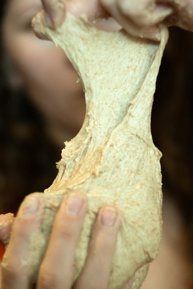 В начале замеса клейковина у теста развита еще очень плохо, мука и вода только смешались, их молекулы только соединились, белок муки еще не успел достаточно набухнуть и сформировать «каркас» из эластичных нитей и пленок. Если вернуться на шаг назад и посмотреть на эту массу до замеса, то вот что мы увидим: до того, как соединиться с водой, мука была просто скопищем мельчайших частиц, в которых, конечно, была клейковина, но ее молекулы были хаотично разбросаны в мучном порошке.