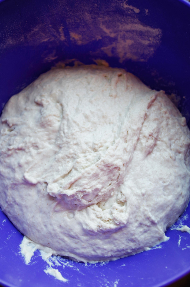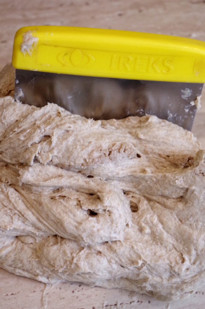 3) Третий способ — стирка. Он действительно похож на то, как стирают белье руками, тесто просто растирается друг о друга, как будто отмывается. Можно растирать о стол, можно обеими руками друг о друга, периодически очищая стол скребком. Этот способ энергичный и довольно быстрый, буквально за 10 минут тесто дойдет до кондиции. К сожалению, снять этот процесс мне не удалось, для этого нужны обе руки :) Но принцип, я думаю, понятен.