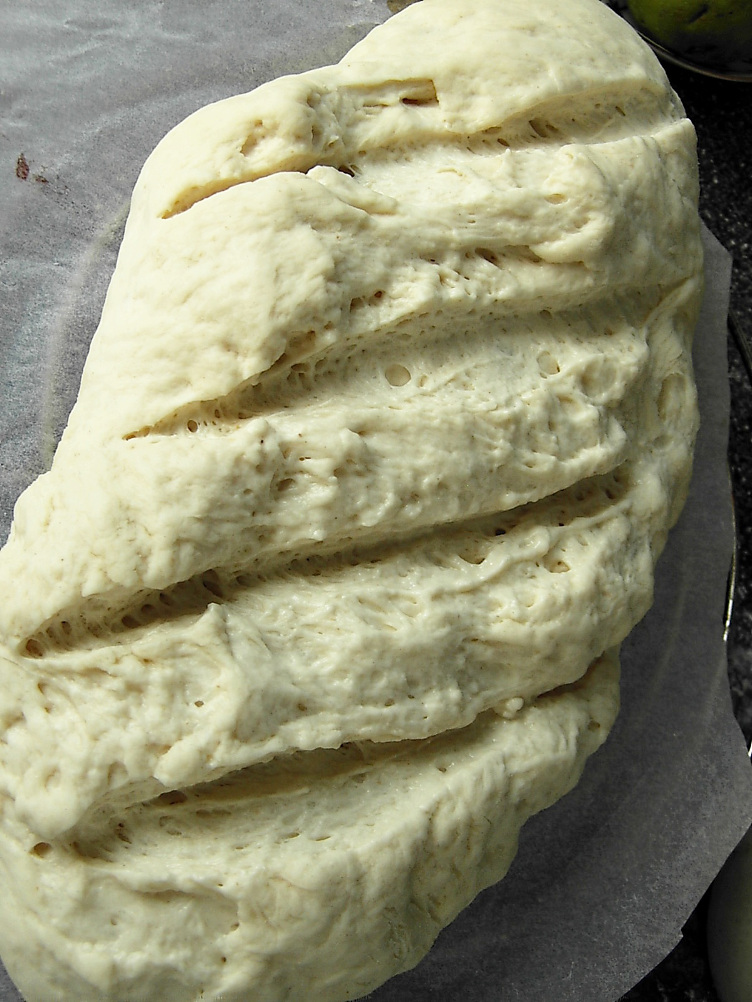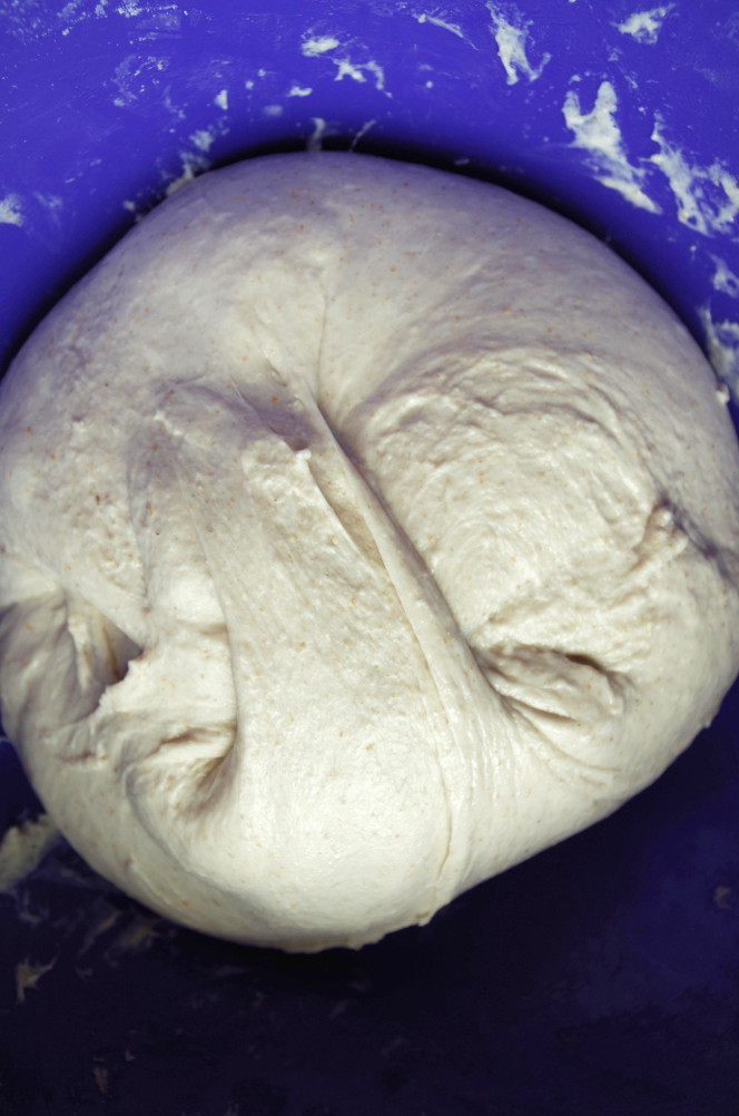 При этом хочу заметить, что тесто различной консистенции будет вести себя по-разному. К примеру, влажное мягкое тесто с хорошо развитой клейковиной (для багетов и чабатты) будет тянуться в тонкие пленки, а при складывании выдавать в местах сгибов крупные тонкостенные пузыри. Тесто крутой консистенции ничего подобного не сможет, но на его поверхности будут видны тонкие прозрачные, почти плоские пузырики, оно будет мягким, гладким, как отполированный булыжник, и легко сворачиваться в шар, без разрывов. Я как-то, пытаясь разобраться, когда же мое тесто дойдет до кондиции, месила-месила крутое тесто, пыталась растянуть его в тонкие пленки, но ничего подобного не увидела. Да, в общем-то, и не могла увидеть, такое тесто не способно на такие «тонкости». Аналогично и с тестом средней консистенции. Хорошо вымешанное, оно будет очень эластичным и его можно несколько раз без ущерба свернуть в конверт, оно при этом не будет рваться от натяжения. Все же, какой бы консистенции и влажности ни было тесто, прежде чем пытаться его сложить в шар или растянуть в пленку, то есть, проверить, как развита клейковина, дайте ему как следует отдохнуть и расслабиться, полежать минут 15-20. Тесто без отдыха, находясь в напряжении, будет сильно сопротивляться и рваться.